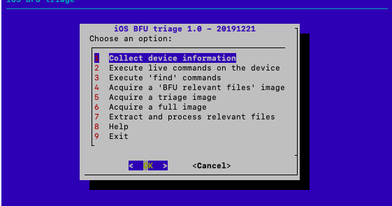 ios_bfu_triage, in summary, is a script that you can run on MacOS to extract data from a “chekcra1ned” iOS device. The possibilities include collecting device information, executing live commands, and acquiring a full image! Read more here: