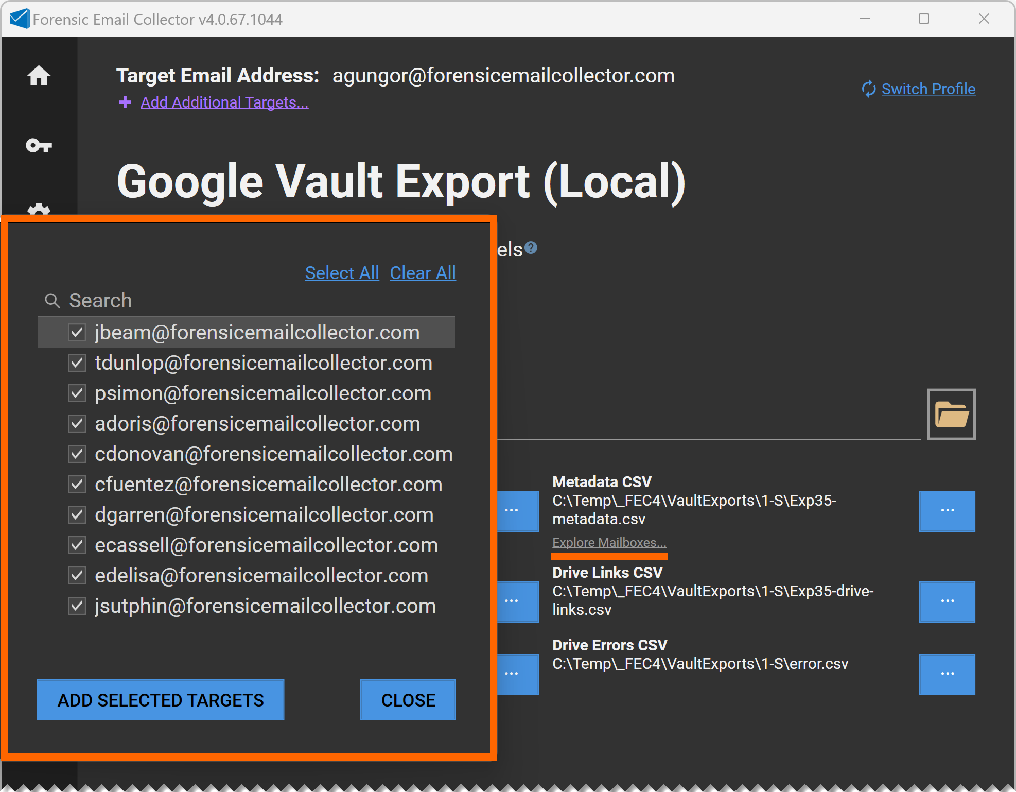 The Explore Mailboxes user interface quickly scans the Vault export for a list of targets, and allows configuring batch acquisitions.