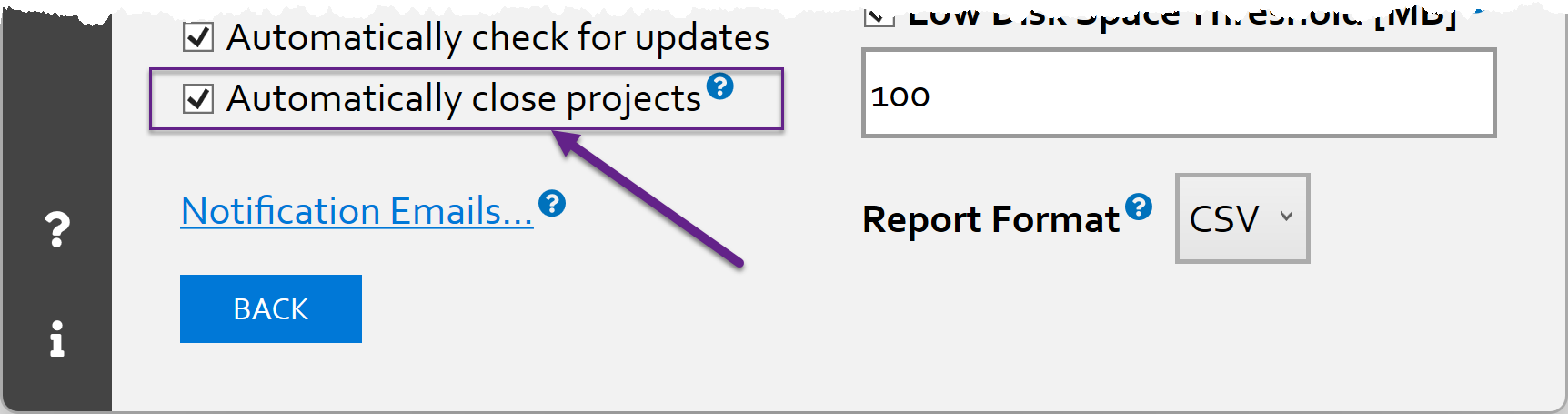The Automatically close projects option is selected by default and controls whether FEC automatically clears credentials in successfully-completed acquisition projects.