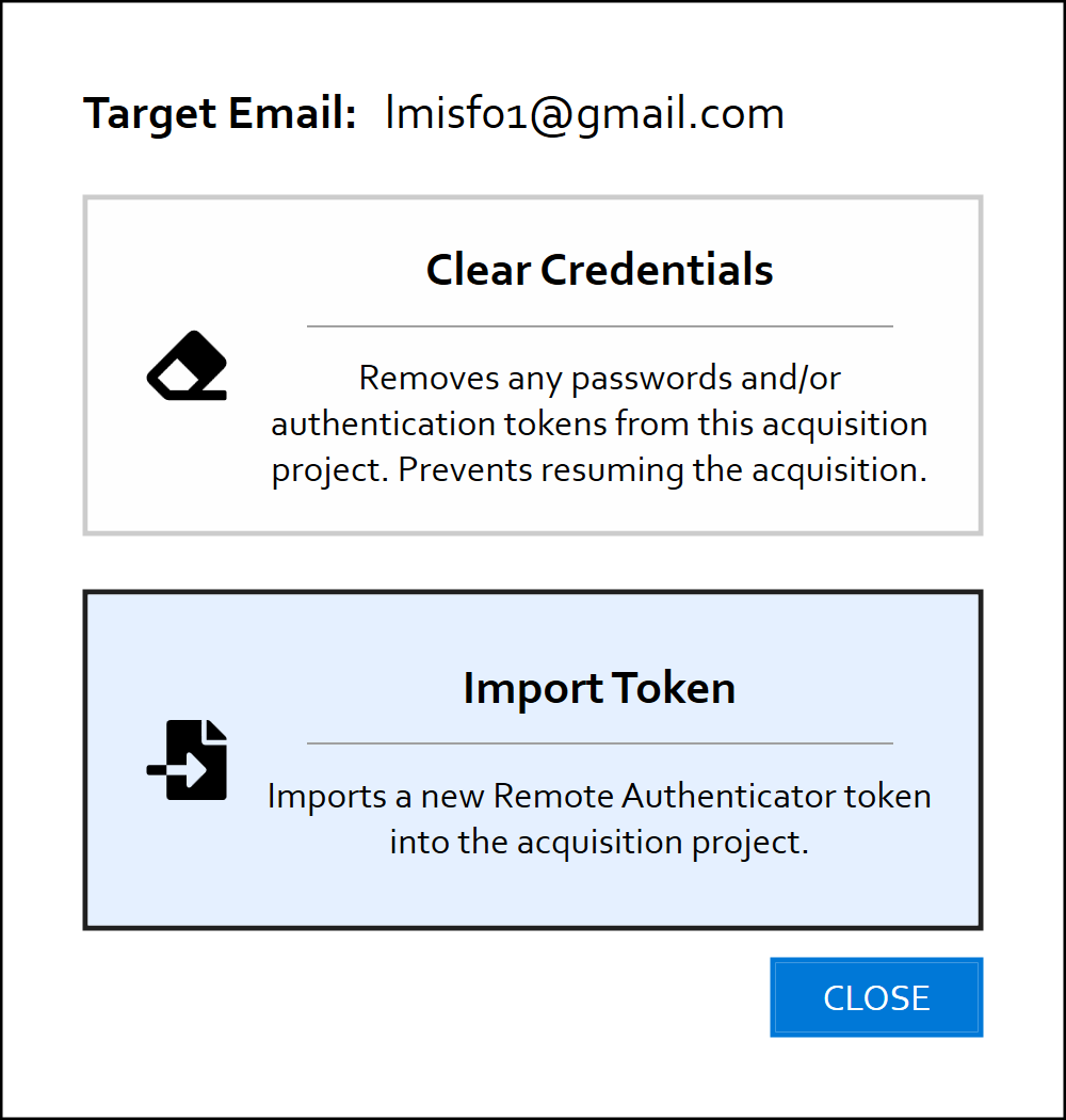 In addition to clearing credentials in an acquisition project, Credential Manager also allows you to replace the credentials. For instance, if the Remote Authenticator token you used to configure the acquisition was inadvertently invalidated by the end-user, you can clear that token and import a new one to keep going. Similarly, if the app password you used during an IMAP acquisition has changed, you can update it mid-acquisition with Credential Manager. ![]()