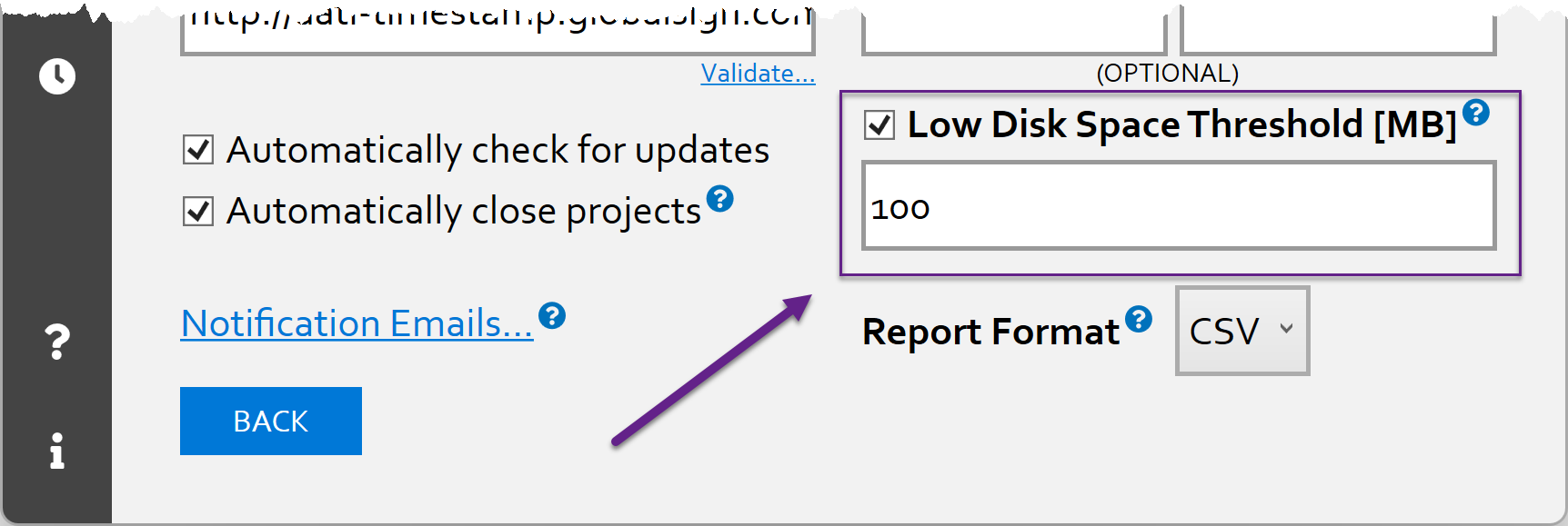 You can now configure an optional low disk space threshold in FEC’s Preferences Page.
