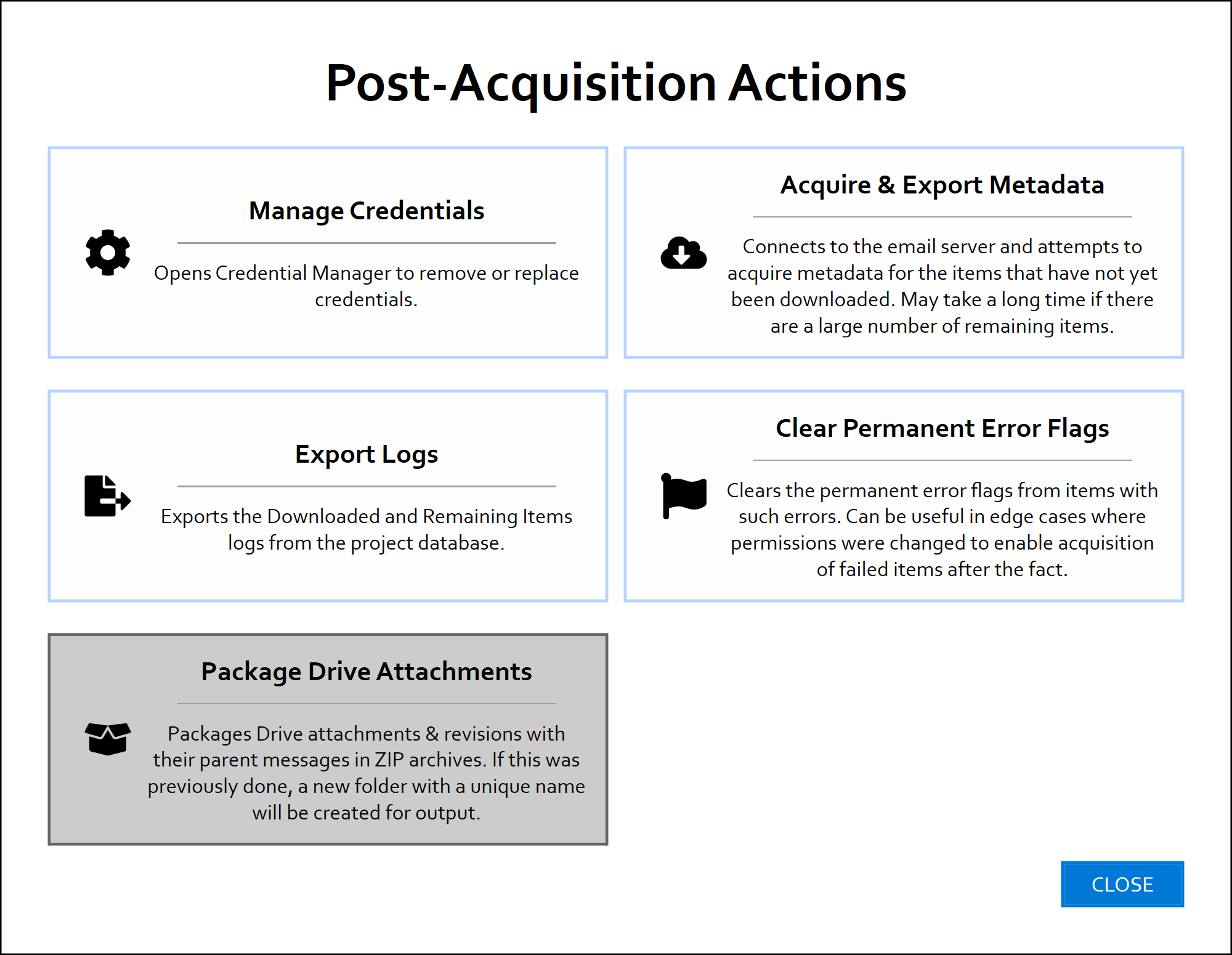 In some rare cases, it may be possible to remedy these errors during or after the acquisition. For instance, it may be possible for the end-user to fix a permission issue that prevented a Drive item from being acquired. In such cases, you can clear the permanent error flags so that FEC retries items with permanent errors the next time you resume the acquisition.