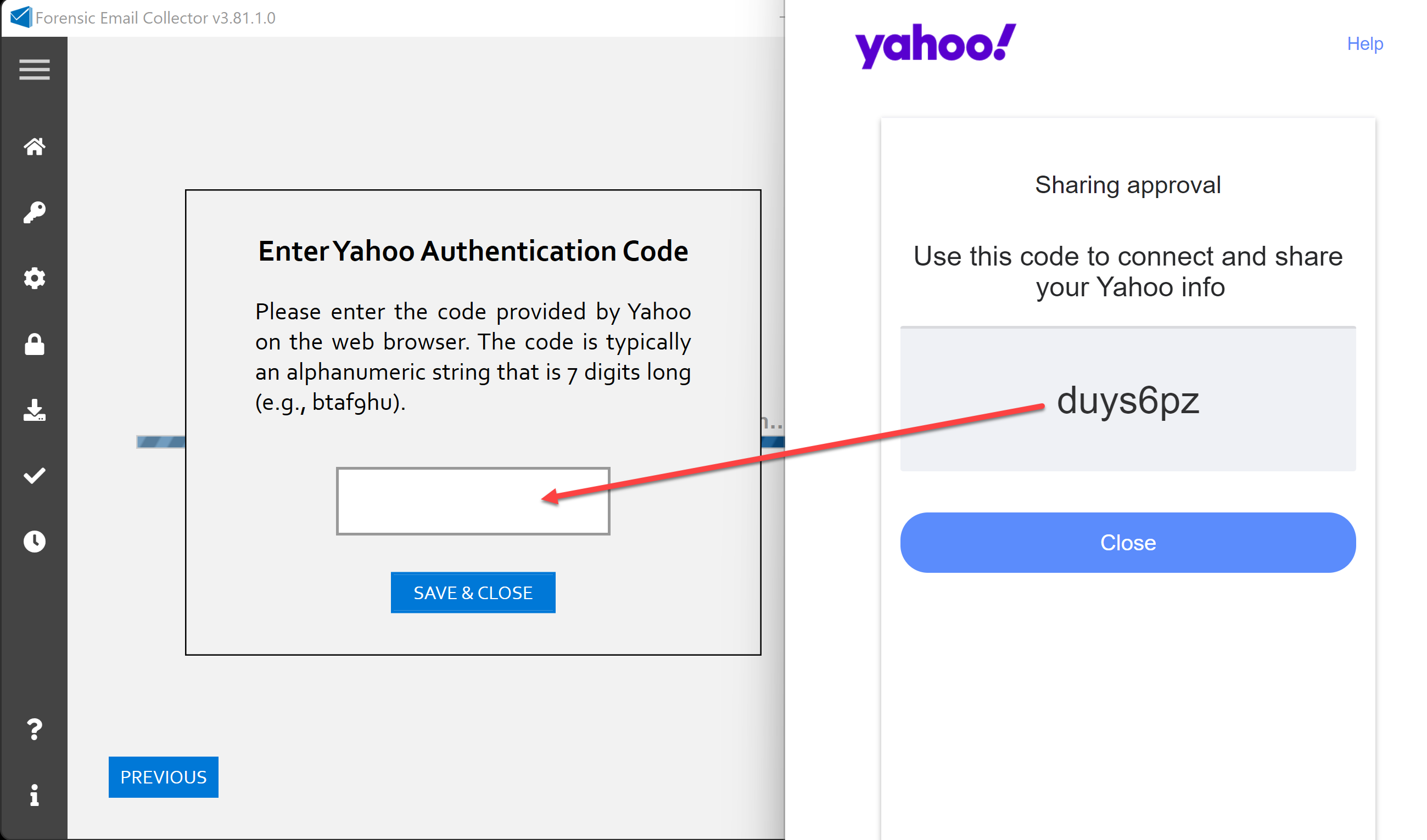 The authentication workflow, at least in this initial version, is slightly different than what we do for Google and Microsoft. Specifically, after the authorization within the web browser, Yahoo / AOL presents a 7-digit code which is entered into FEC. This only happens during the initial authorization process, and looks as follows: