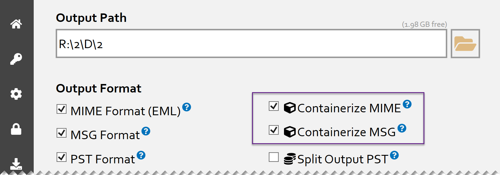 FEC can now pack its MIME or MSG output into VHDX disk images. You can trigger automatic containerization on the Output page as follows: