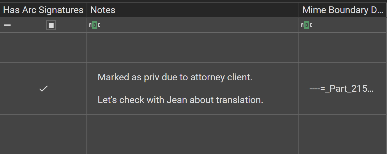 The notes entered for each document are immediately reflected on the Evidence Grid and can be used for filtering ![]()