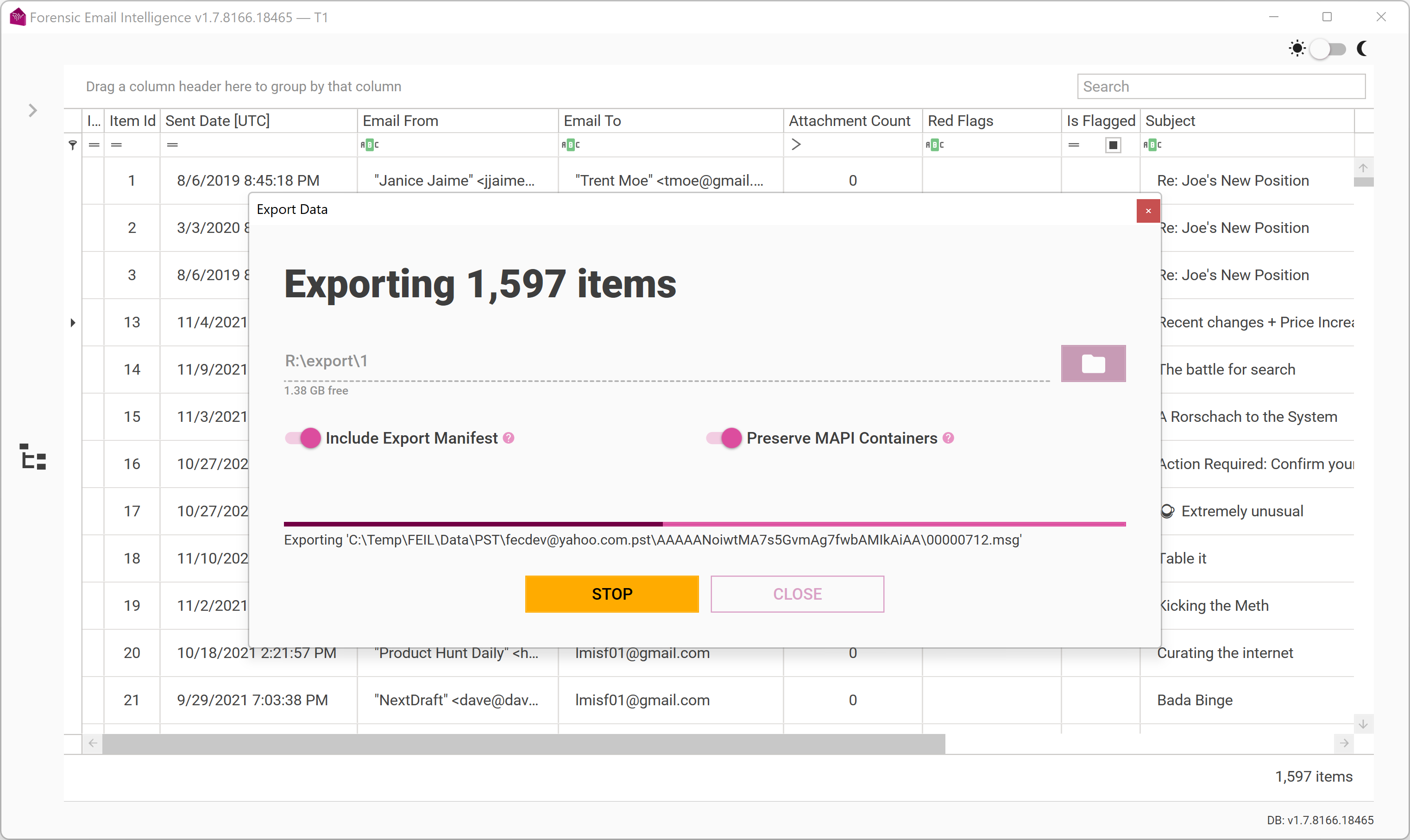 It is now possible to export items in an FEI Project individually or within MAPI containers (i.e., PSTs) where applicable. An export manifest in CSV format will automatically be included with your export.