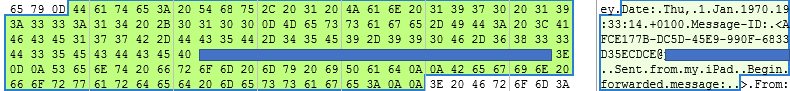 The email came from a Time-Machine backup set. This sample of the filenames and their details is an example. They didn’t have an EML or EMLX extension and the file extension appears to be some sort of Latitude/Longitude coordinates. The created dates of the emails that have the date issue are similar to the 1970 date/time in the first example. The common denominator in all of the problem emails is they have Sent from my iPad or forwarded from my iPad.
